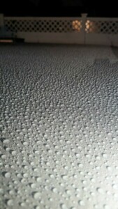 Erős eső után a balkonpadló így néz ki – a vízcseppek csak leperegnek róla! Átlátszó, ecsettel felkent réteggel van lezárva, teljesen száraz marad. Szuper eredmény!